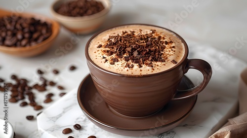 Delicious Steaming Hot Latte in Chocolate Cup on White Marble Counter