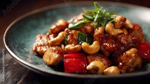Delicious stir fried chicken with crunchy cashew nuts vibrant red bell peppers and fresh green herbs served on a beautiful teal ceramic plate