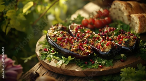 Delicious stuffed eggplant on a wooden board garnished with herbs, pomegranate seeds, and fresh bread in a vibrant setting.