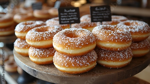 Delicious sugar-coated donuts stacked on a wooden tray.