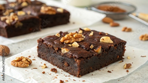 Delicious sweet potato brownie topped with walnuts served on a clean surface perfect for dessert lovers