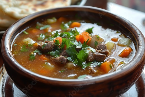 Delicious Tashreeb bread stew featuring lamb and fresh vegetables served in a traditional bowl