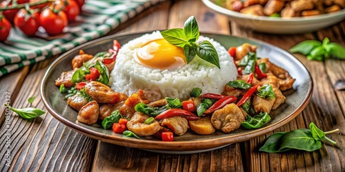 Delicious Thai Stir-Fried Chicken with Basil on Rice and Fried Egg – A Panoramic View of this Flavorful Dish