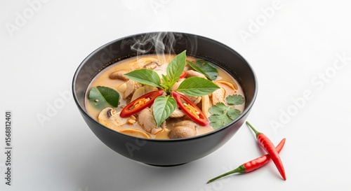 Delicious Thai Tom Yum Soup Garnished with Fresh Herbs and Red Chili Peppers