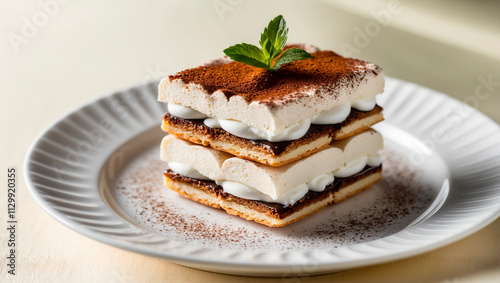 Delicious tiramisu dessert garnished with mint on a white plate