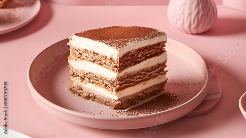 Delicious Tiramisu on a Pink Plate.