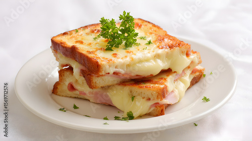 Delicious toasted sandwich with melted cheese and ham served on a white plate in a cozy Parisian café setting