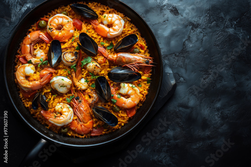 Delicious traditional Spanish seafood paella showcasing vibrant shrimp, mussels, and flavorful rice, perfect for a festive gathering