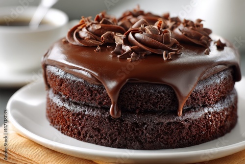 Delicious two-layer chocolate cake topped with rich frosting and chocolate shavings served with coffee