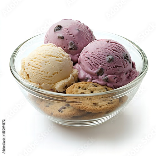 Delicious Vanilla and Berry Ice Cream Scoops with Chocolate Chip Cookies in Glass Bowl