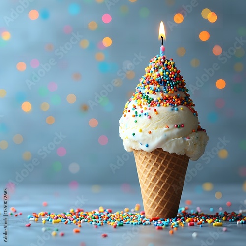 Delicious Vanilla Ice Cream Cone with Sprinkles and Candle for Birthday Celebration