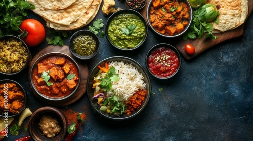 Delicious varieties of Indian dishes are beautifully arranged on a rustic wooden table, featuring colorful curries, rice, and fresh herbs, inviting food lovers to enjoy a delightful meal together