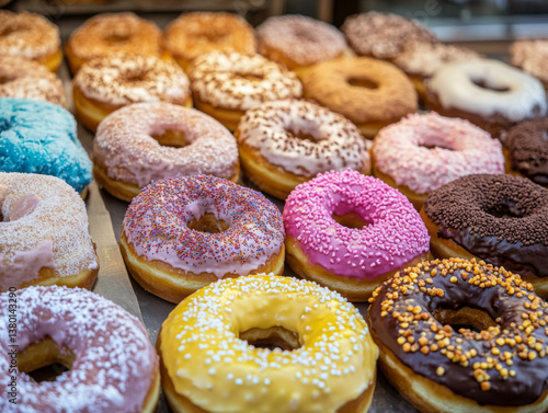 Delicious variety of colorful doughnuts with different toppings and flavors
