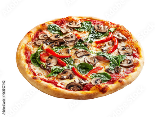 Delicious vegetable pizza topped with mushrooms and spinach, transparent