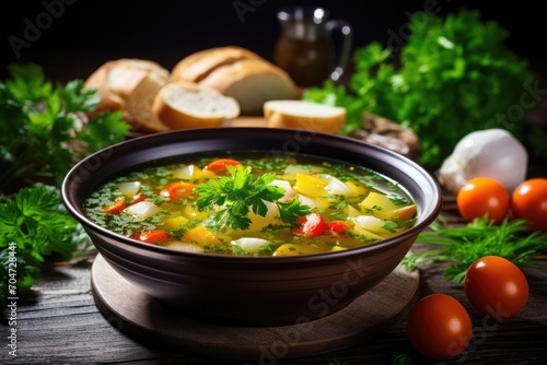 Delicious vegetable soup in a bowl on the table