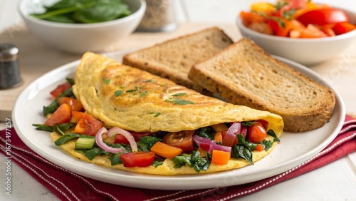 Delicious veggie packed omelet served with whole grain toast and fresh tomatoes on a rustic table in a cozy kitchen