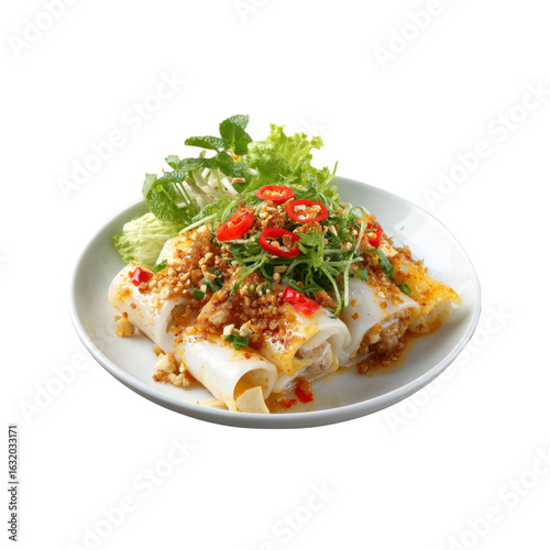 Delicious Vietnamese Banh Cuon with Spicy Peanut Sauce and Fresh Herbs