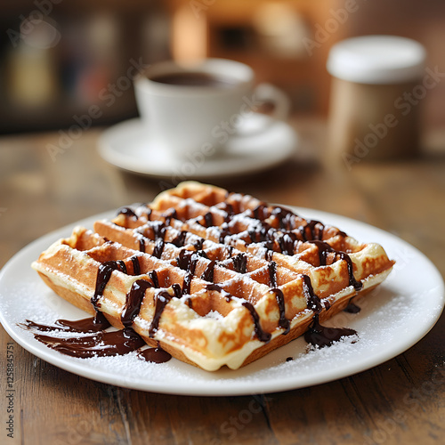 Delicious waffle topped with chocolate sauce and powdered sugar next to a cup of coffee in a cozy setting