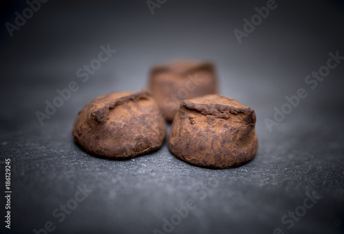 Delicious, yummy and indulgent home made luxury chocolate truffles resting on a black slate background