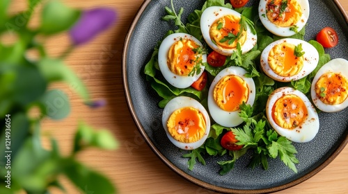 Deliciously arranged soft-boiled egg garnished with herbs and cherry tomatoes on a rustic plate