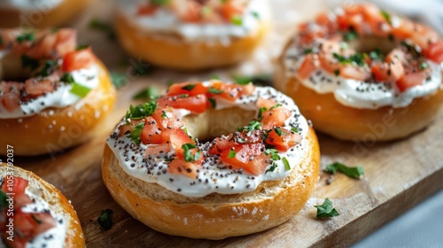 Deliciously baked bagels adorned with enticing toppings and creamy additions for a delightful breakfast or brunch experience