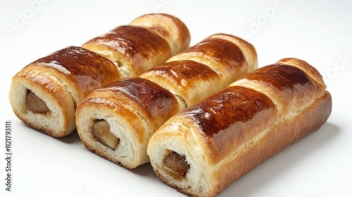 Deliciously baked Japanese rolls with a shiny glaze arranged neatly on a white background showcasing their appealing texture and color.