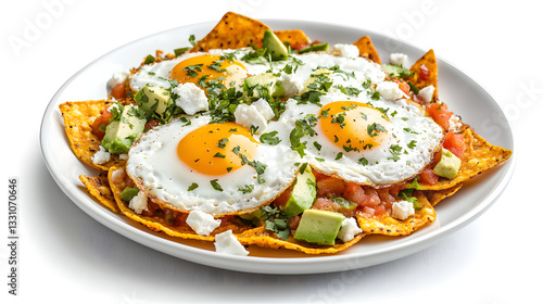 Deliciously Composed Breakfast Nachos with Eggs, Avocado, and Fresh Ingredients on White Plate