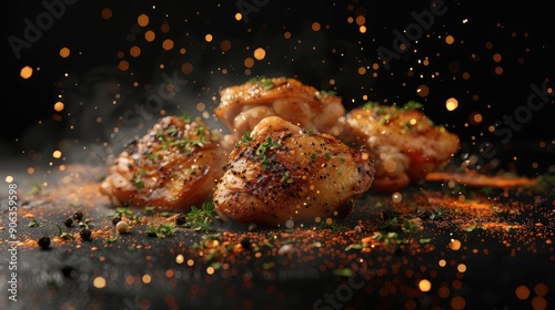 Deliciously cooked chicken thigh with spices, sprinkled with herbs, creating a savory and appetizing culinary scene.
