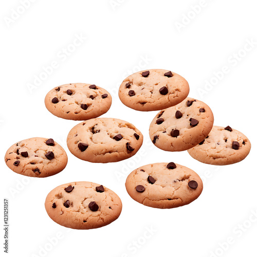 Deliciously freshly baked chocolate chip cookies with gooey chocolate pieces isolated on a clean PNG background, perfect for sweet treat illustrations, holiday baking visuals, and culinary marketing p
