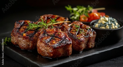 Deliciously grilled steak medallions served with creamy blue cheese and fresh garnish