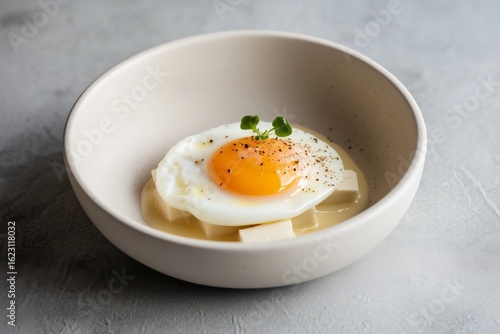 Deliciously plated fried egg with a vibrant yolk, garnished with microgreens, served on a smooth, minimalist bowl against a neutral textured background, showcasing culinary artistry