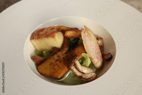 Deliciously plated mushroom dish in a white bowl, ready to enjoy. This appetizing meal is composed of cooked mushrooms, presented elegantly for a delightful dining experience