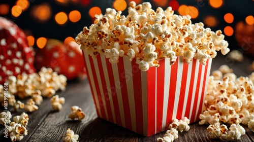 Deliciously popped popcorn in a striped box with festive lights creating a cozy atmosphere for movie night