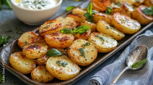 Deliciously Roasted Golden Potatoes Topped With Herb Yogurt Sauce and Fresh Greens