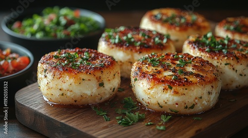 Deliciously seared round food items on a wooden board.