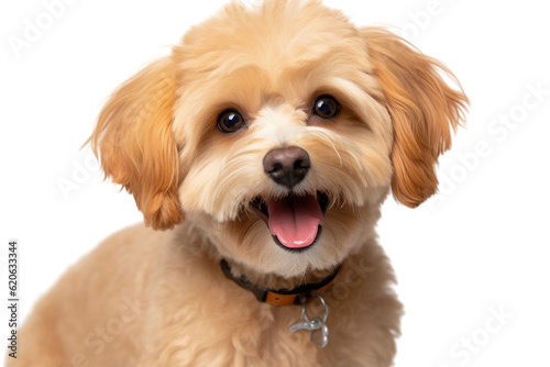 Delight can be seen on the face of a charming little dog, which has a golden coat. This maltipoo dog stands alone against a transparent background, capturing the essence of motion, beauty, veterinary