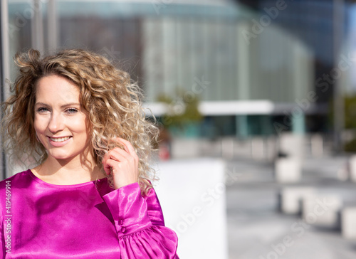 Delighted female standing in street on sunny day and touching blond curly hair while looking at camera