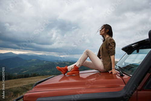 Delighted young woman resting on the car hood while spending her weekend in the mountains