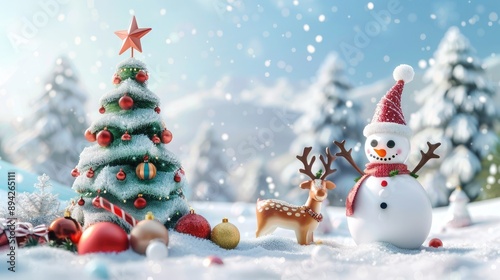 Delightful 3D rendering of cute Christmas elements, including a cheerful snowman, a decorated Christmas tree, and a playful reindeer, set against a snowy landscape background, perfect for holiday-them