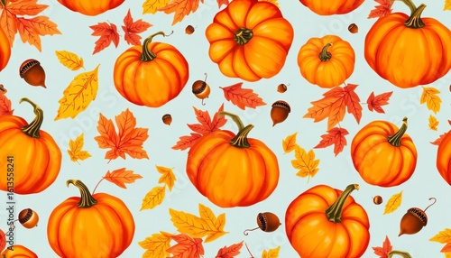 Delightful autumn harvest seamless pattern featuring pumpkins, leaves, and acorns, wallpaper, textile