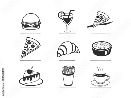 Delightful Bites: A collection of appetizing food illustrations in a monochrome palette, showcasing a variety of culinary delights from savory to sweet.