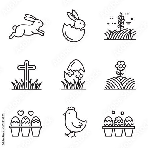 Delightful collection of easter themed line art icons featuring bunnies eggs and symbols