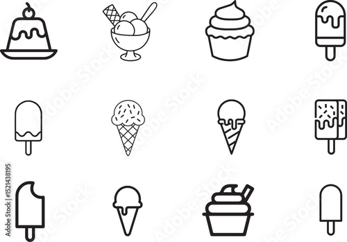Delightful collection of outline icons featuring various ice cream treats, popsicles, sundaes, and desserts, perfect for menus, sweet shop branding, and summer-themed designs, evoking deliciousness.
