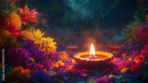 Delightful Diwali Greeting Background with Traditional Diya Lamp, Colorful Flowers, and Blurred Candlelight