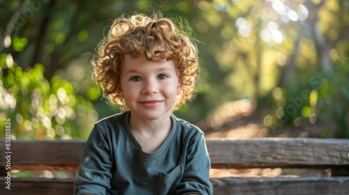 Delightful portrait of a curly-haired boy sitting on a wooden bench in a sunlit park