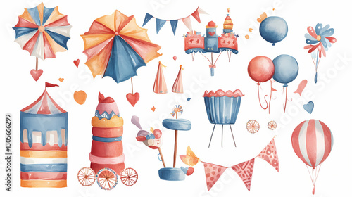 Delightful sticker set with watercolor illustrated toys for nursery and playroom decor. Whimsy - Carnival. Illustration