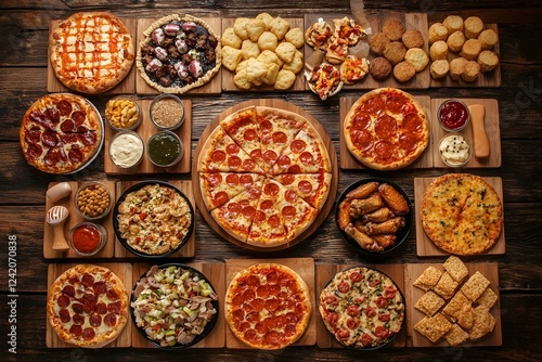 Delightful Super Bowl or Football Themed Food Spread on Rustic Wooden Surface