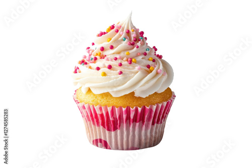 Delightful vanilla cupcake topped with fluffy frosting and colorful sprinkles on a white background isolated on transparent background