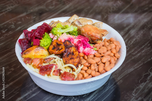 Deliver food, marmita ou marmitex with rice, beans, beets, broccoli, mayonnaise with vegetables, fried chicken, beef stroganoff, pasta and bacon on a dark marble table.