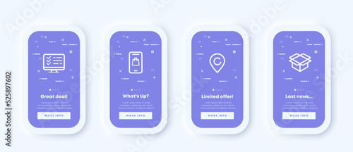 Deliver parcels set icon. Buy online, phone, shop, purchase, delivery address, box, package, pack, map pointer, destination. Logistics concept. Neomorphism. UI phone app screens. Vector line icon